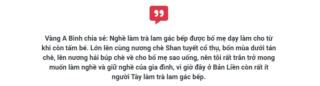 Không chỉ làm ra sản phẩm trà lam gác bếp theo phương pháp truyền thống của đồng bào Tày Bản Liền, anh Vàng A Bình còn trình diễn các công đoạn hái trà, sao trà và lam trà để khách du lịch cùng trải nghiệm, nếu họ đến Bản Liền đúng mùa lam trà.