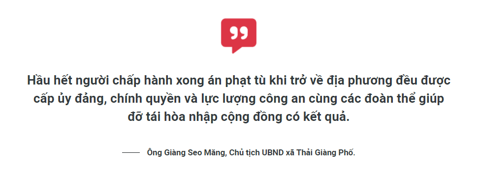 Cũng như chị S., anh Giàng Seo L. ở thôn San Sả Hồ gặp nhiều khó khăn sau khi chấp hành xong án phạt tù trở về địa phương. Trước thực tế đó, Công an xã đã hỗ trợ gia đình anh 1 con lợn giống, 100 kg ngô và 100 kg thóc. Hội Phụ nữ xã hỗ trợ thêm 1 con lợn giống. Mặt trận Tổ quốc, Đoàn Thanh niên xã, Trường Phổ thông Dân tộc bán trú Tiểu học Thải Giàng Phố cùng người dân trong thôn giúp đỡ lương thực, nhu yếu phẩm, đồ dùng sinh hoạt cho gia đình anh L. Nhờ vậy, anh L. có điều kiện ban đầu để phát triển kinh tế, tái hòa nhập cộng đồng tốt hơn.