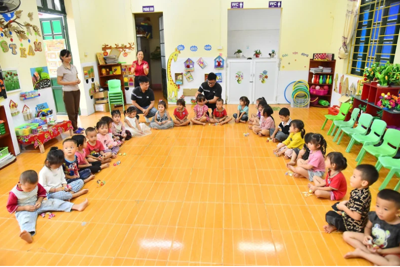 Các nhà hảo tâm trao quà tặng học sinh Trường mầm non Hợp Thành (xã Hợp Thành, thành phố Lào Cai, tỉnh Lào Cai). (Ảnh MỸ HÀ)