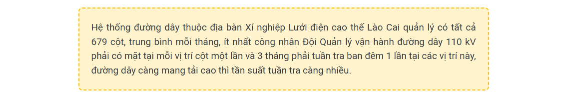 5 giờ sáng, cán bộ, công nhân Đội Quản lý vận hành đường dây 110 kV Lào Cai (Xí nghiệp lưới điện cao thế Lào Cai) đã lịch kịch đồ đạc chuẩn bị lên đường. Anh Trần Văn Chiển, Đội trưởng bảo hôm nay vị trí thao tác ở xa và cần hoàn thành công việc trước 7 giờ 30 phút để một đơn vị khác vào thi công. Công tác trong ngành điện hơn 21 năm thì cũng là từng ấy năm anh Chiển gắn bó với công tác vận hành lưới điện cao thế. Ở đâu có tuyến đường dây 110 kV thì ở đó đều đã in dấu bước chân anh và các đồng nghiệp.