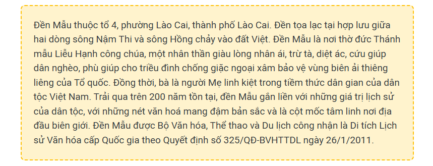 Khánh tiệc Đức thánh Mẫu được tổ chức tại đền Mẫu, phường Lào Cai, thành phố Lào Cai là dịp để người dân bày tỏ lòng thành kính, biết ơn tới vị Thánh mẫu Liễu Hạnh – một trong bốn vị thánh tứ bất tử của dân tộc Việt Nam.