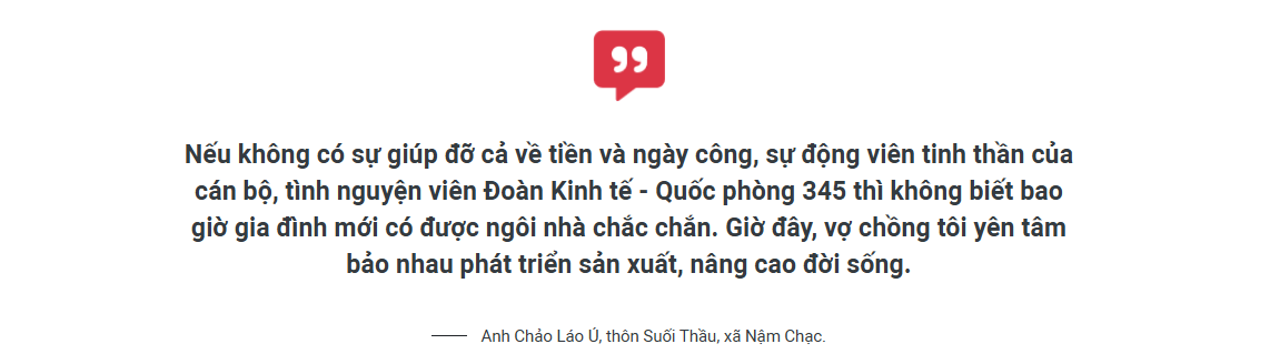 Biết được hoàn cảnh, năm 2023, Đoàn Kinh tế - Quốc phòng 345 đã hỗ trợ 80 triệu đồng từ nguồn xã hội hoá, đồng thời cử cán bộ, tình nguyện viên giúp đỡ nhiều ngày công vận chuyển vật liệu và san tạo mặt bằng. Trong đó khó khăn nhất là đào móng, bởi vị trí xây nhà có nhiều đá, bộ đội phải dùng hoàn toàn thủ công để phá đá. Sau một thời gian xây dựng, ngôi nhà “tình quân dân” khang trang, vững chãi, rộng hơn 90 mét vuông đã hoàn thành, giúp gia đình anh Ú ổn định cuộc sống, không còn lo lắng mỗi khi mưa gió hoặc mùa đông rét mướt như trước.