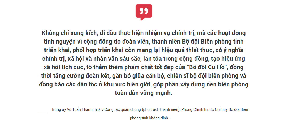 Xung kích thực hiện nhiệm vụ bảo vệ chủ quyền an ninh biên giới quốc gia, đoàn viên, thanh niên là cán bộ, chiến sĩ ở các đơn vị đã tổ chức thực hiện nghiêm các biện pháp công tác nghiệp vụ, bảo vệ chủ quyền, toàn vẹn lãnh thổ và trật tự an toàn xã hội trên địa bàn quản lý; đấu tranh hiệu quả với các loại tội phạm. Năm 2024, các đơn vị đã tổ chức, phối hợp tổ chức tuần tra bảo vệ biên giới được 595 buổi với hơn 3.200 lượt người tham gia. Đặc biệt, khi bão số 3 gây hậu quả nghiêm trọng về người, tài sản, các đơn vị đã cử hơn 2.000 lượt cán bộ, chiến sĩ là đoàn viên, thanh niên phối hợp với các lực lượng chức năng, Nhân dân trên địa bàn khắc phục hậu quả thiên tai. Qua đó, đã tuyên truyền vận động 483 hộ ở khu vực nguy cơ sạt lở cao, vùng ngập lụt đến nơi an toàn. Chi đoàn các đơn vị cũng kêu gọi, phối hợp với các tổ chức, cá nhân thiện nguyện trao quà, cứu trợ người dân bị thiệt hại, trị giá hơn 18 tỷ đồng.