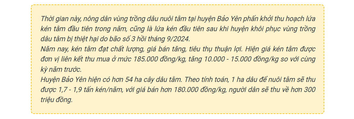 Cây dâu tằm được huyện Bảo Yên xác định là một trong những cây trồng chủ lực và khuyến khích phát triển ở các bãi bồi ven sông, suối thuộc 6 xã: Kim Sơn, Cam Cọn, Bảo Hà, Việt Tiến, Xuân Thượng, Nghĩa Đô. Huyện phấn đấu đến hết năm 2025 khôi phục toàn bộ diện tích như trước Covid-19 (khoảng 300 ha), đến hết năm 2030 nâng diện tích vùng trồng dâu toàn huyện lên 500 ha, đồng thời kêu gọi đầu tư được ít nhất 1 nhà máy ươm tơ trên địa bàn.