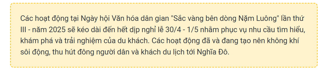 Ngày hội Văn hóa dân gian “Sắc vàng bên dòng Nặm Luông” lần thứ III - năm 2025 gồm chuỗi hoạt động văn hóa, văn nghệ, thể thao diễn ra từ ngày 27/4, như: Giải chạy Marathon “Nghĩa Đô Xanh” lần thứ 3 - năm 2025; Ngày hội Văn hóa dân gian các trường học cụm xã Nghĩa Đô; Giải Kéo co, bắn nỏ xã Nghĩa Đô; Giải bóng đá nữ. Sau lễ khai mạc, sẽ có các hoạt động như: Lễ hội quả còn, thi gánh nước, thi diễu hành đi cà kheo, thi đan lát, lướt mảng, giao hữu bóng chuyền da nam… và nhiều trò chơi dân gian thú vị khác.