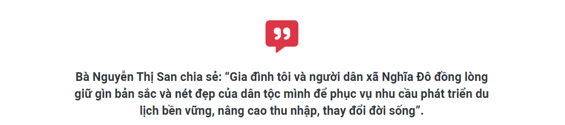 Phát triển du lịch gắn với bảo tồn văn hóa địa phương là chiến lược phát triển du lịch của Nghĩa Đô. Chia sẻ về mục tiêu này, ông Lý Văn Nội, Chủ tịch UBND xã Nghĩa Đô, huyện Bảo Yên cho biết: “Nghĩa Đô luôn tạo điều kiện và khuyến khích người dân tham gia bảo tồn, phát triển nghề truyền thống. Bà Nguyễn Thị San cùng nhiều bà con tại địa phương đã tích cực tham gia gìn giữ trang phục truyền thống, nghề đan lát, thêu dệt thổ cẩm, góp phần phát triển du lịch cộng đồng bền vững tại Nghĩa Đô”.