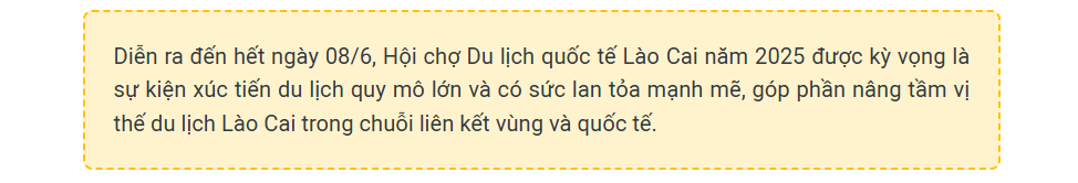 Với quy mô 130 gian hàng tiêu chuẩn, hội chợ thu hút sự tham gia của nhiều doanh nghiệp thuộc 15 quốc gia, vùng lãnh thổ và 40 tỉnh, thành phố trong cả nước. Đây là cơ hội để giới thiệu những sản phẩm, dịch vụ du lịch đặc sắc, độc đáo của các địa phương, qua đó, kích cầu tiêu thụ, đưa sản phẩm tiêu biểu của Lào Cai đến gần hơn với thị trường trong nước và quốc tế.