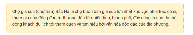 Chợ văn hóa Bắc Hà được biết đến là chợ gia súc (chợ trâu) nổi tiếng vùng cao nguyên Bắc Bà và được đánh giá là một trong những chợ phiên đặc sắc nhất Đông Nam Á họp chợ vào ngày thứ 6 hằng tuần.
