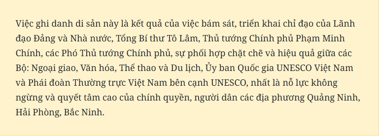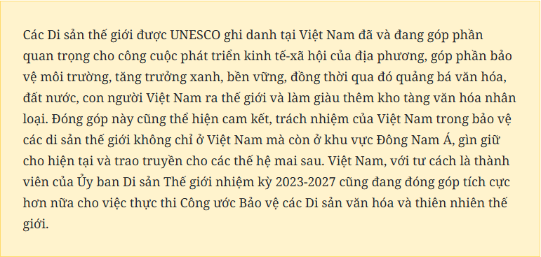 Đây cũng là một đóng góp nữa của Việt Nam cho mục tiêu bảo tồn và phát huy các giá trị di sản mà UNESCO đang thúc đẩy. Niềm vinh dự, tự hào luôn đi cùng với trách nhiệm, đòi hỏi các cấp, các ngành, các địa phương cần nâng cao nhận thức, triển khai đồng bộ các biện pháp thiết thực và hiệu quả bảo tồn và phát huy giá trị của di sản theo đúng tinh thần Công ước Di sản thế giới gắn với phát triển bền vững.