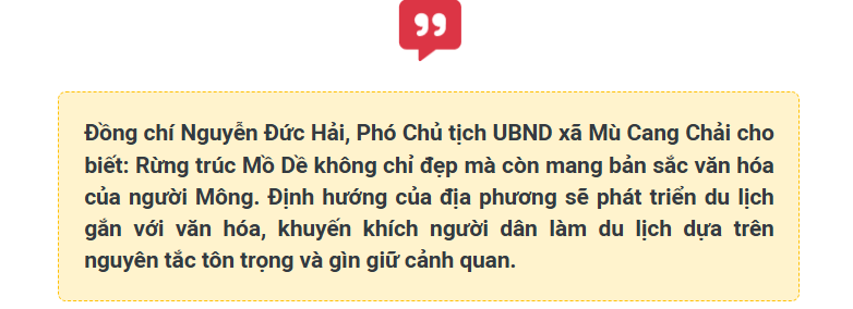 Tại vùng đất Mù Cang Chải, nếu Tú Lệ là gam vàng rực rỡ, đèo Khau Phạ là đường cong của đất trời, thì rừng trúc Mồ Dề là mảng xanh dịu mát, âm thầm mà đầy sức sống, giữ chân du khách bằng cách riêng lặng lẽ, chân thành và nguyên sơ.