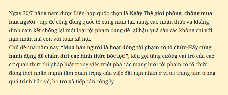 Cũng trong khuôn khổ sự kiện, bà Pauline Tamesis, Điều phối viên thường trú Liên hợp quốc tại Việt Nam, nhận định: “Việt Nam đang chuẩn bị tổ chức lễ ký kết Công ước Hà Nội, hiệp ước toàn cầu đầu tiên nhằm giải quyết tội phạm mạng, đánh dấu một bước ngoặt trong hợp tác quốc tế nhằm chống lại các tội phạm sử dụng công nghệ, bao gồm cả mua bán người.