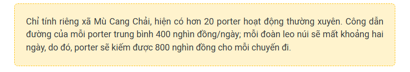 Những năm gần đây, trekking trở thành xu hướng xê dịch của nhiều người với mục đích thử thách giới hạn của bản thân, chinh phục các đỉnh núi và rèn luyện sức khỏe. Có cầu ắt có cung, người đi leo núi nhiều sẽ cần người dẫn đường, từ đó, số lượng porter cũng phát triển theo. Ở Mù Cang Chải, dẫn đường và khuân vác đồ cho du khách nổi lên như một nghề, vừa tận dụng được nguồn lao động có sức khỏe, thông thạo địa bàn miền núi, vừa mang lại nguồn thu nhập đáng kể cho người dân địa phương.