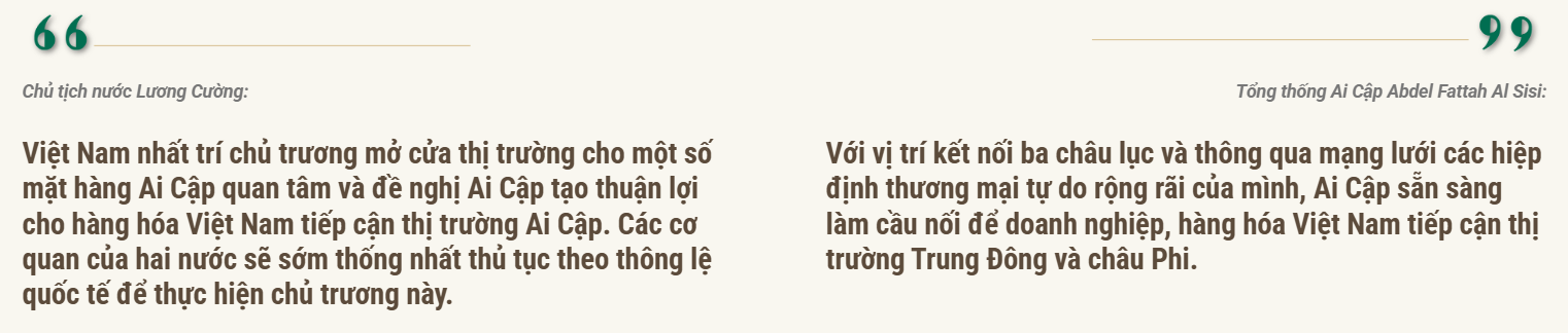 Trên cơ sở đó, để phù hợp với tầm mức của quan hệ song phương, đáp ứng nguyện vọng của nhân dân hai nước cũng như với mong muốn đóng góp cho hòa bình, ổn định, hợp tác và phát triển ở mỗi khu vực và trên thế giới, hai bên nhất trí nâng cấp quan hệ song phương lên Đối tác toàn diện. Hai bên cũng nhất trí thành lập Nhóm công tác nghiên cứu khả năng đàm phán Hiệp định thương mại tự do Việt Nam-Ai Cập; đẩy mạnh hợp tác giáo dục, giao lưu nhân dân, tăng cường kết nối xúc tiến du lịch, quảng bá điểm đến, văn hóa, con người của hai bên.