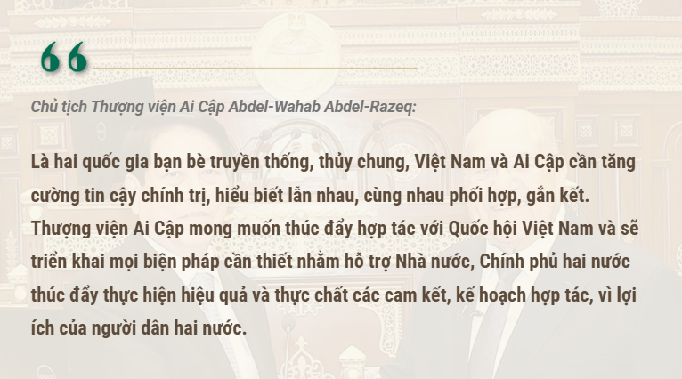 Để đưa quan hệ Việt Nam-Ai Cập tiếp tục phát triển hơn nữa vì lợi ích, ấm no và hạnh phúc của người dân hai nước trong thời gian tới, hai bên nhất trí phát huy hơn nữa vai trò của ngoại giao nghị viện, tăng cường hợp tác giữa Quốc hội hai nước thông qua đẩy mạnh trao đổi đoàn lãnh đạo Quốc hội, lãnh đạo các ủy ban chuyên môn của hai cơ quan lập pháp để chia sẻ kinh nghiệm lập pháp, giám sát; tiếp tục phối hợp chặt chẽ giữa Quốc hội hai nước, thúc đẩy hợp tác giữa Nhóm Nghị viện Arab và Nhóm Nghị viện châu Á tại các diễn đàn nghị viện đa phương, thúc đẩy giao lưu giữa các nghị sĩ trẻ, nghị sĩ nữ. Hai bên nhất trí sớm thành lập Hội Nghị sĩ hữu nghị hai nước để trao đổi thường xuyên, đề xuất các biện pháp tăng cường thúc đẩy hợp tác nghị viện hai nước.