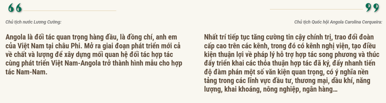 Tại cuộc hội đàm, Chủ tịch nước Lương Cường đã cùng Tổng thống Angola điểm lại những dấu mốc quan trọng trong lịch sử quan hệ hai nước khởi nguồn từ những ngày tháng cùng nhau đoàn kết trong đấu tranh giải phóng dân tộc, thống nhất đất nước, với biểu tượng hữu nghị là Đại lộ Hồ Chí Minh tại trung tâm thủ đô Luanda, Angola.