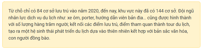 Rõ ràng, trong cách làm du lịch của đồng bào vùng cao nơi đây, cảnh sắc thiên nhiên và bản sắc văn hoá truyền thống được khai thác song hành với giữ gìn, bảo tồn. Họ làm du lịch bằng trái tim, sự chân thành, ấm áp và hiếu khách.