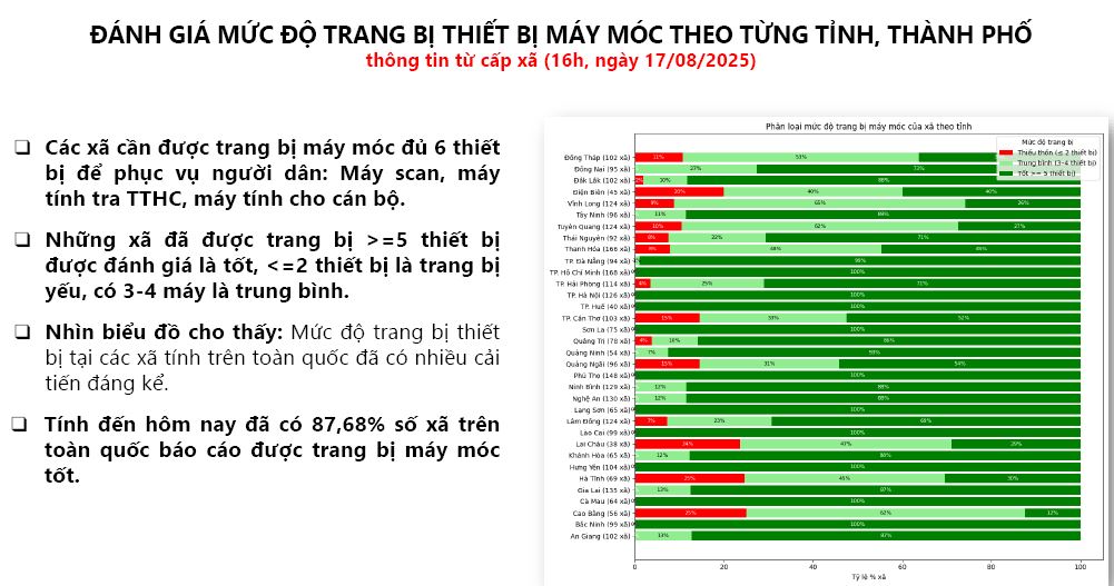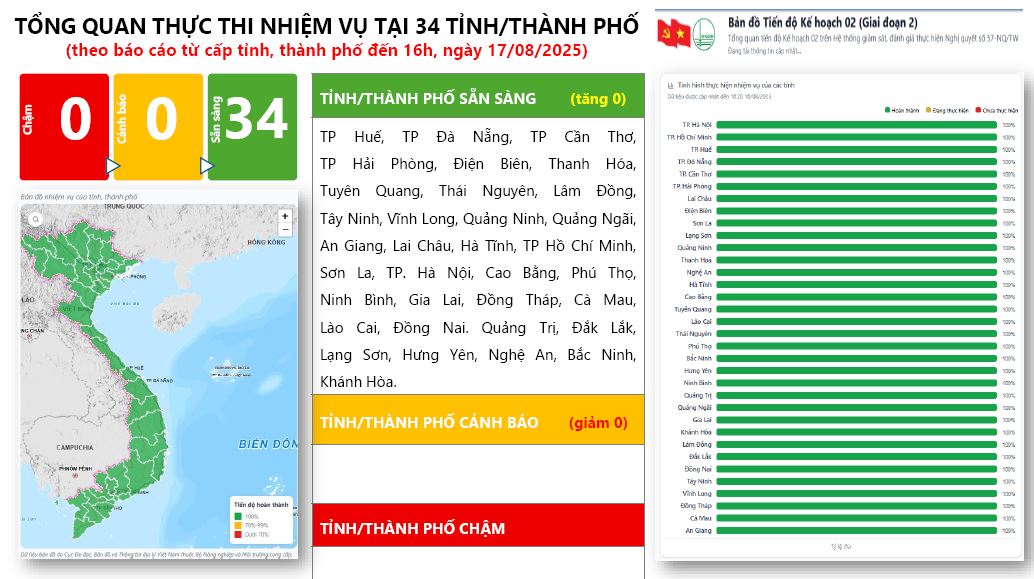 Theo báo cáo tổng hợp tình hình triển khai Kế hoạch 02-KH/BCĐTW của Cơ quan Thường trực Ban Chỉ đạo Trung ương về phát triển khoa học, công nghệ, đổi mới sáng tạo và chuyển đổi số, tính đến 16h00 ngày 17/8/2025, cả nước 34/34 tỉnh, thành phố đạt trạng thái XANH so với tiến độ các công việc phải hoàn thành trước ngày 01/9/2025. Đối với cấp xã, phường, có 23 tỉnh thành phố phủ XANH hơn 50% số xã, phường; có 19 tỉnh, thành phố phủ XANH hơn 70% số xã, phường.