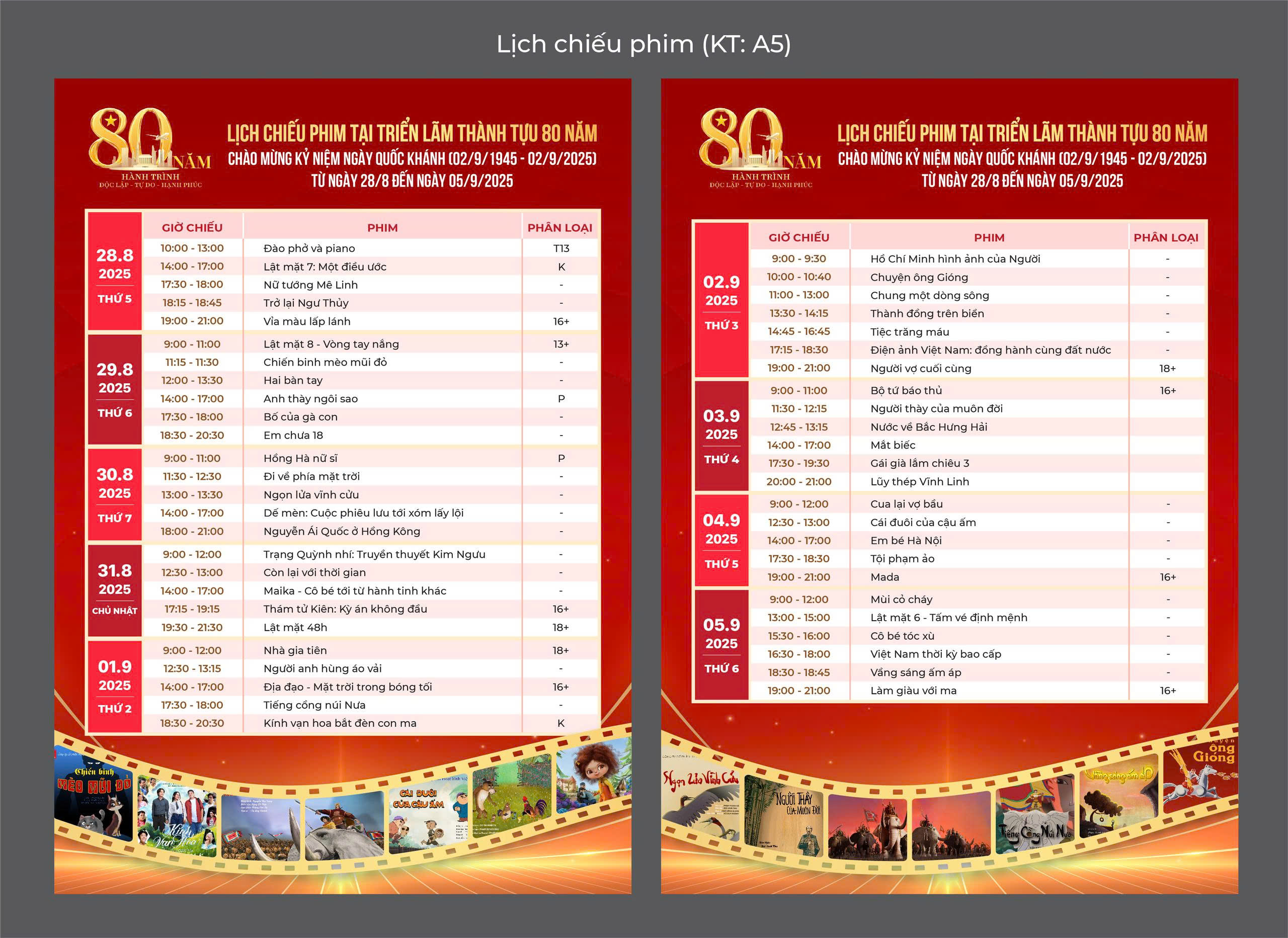 Nhân kỷ niệm 80 năm Cách mạng Tháng Tám và Quốc khánh 2/9, từ ngày 28/8 đến ngày 05/9, tại Triển lãm Thành tựu 80 năm sẽ trình chiếu miễn phí 50 tác phẩm điện ảnh của Việt Nam và giao lưu với các nghệ sĩ, diễn viên.Chương trình chiếu phim chào mừng kỷ niệm 80 năm Cách mạng Tháng Tám và Quốc khánh 2/9 là hoạt động văn hóa-nghệ thuật giàu ý nghĩa mà còn là minh chứng cho sự phát triển mạnh mẽ của nền điện ảnh Việt Nam, không chỉ hấp dẫn nhờ bối cảnh và tiềm năng hợp tác, mà còn bởi bản sắc riêng biệt trong cách kể chuyện và ngôn ngữ điện ảnh.