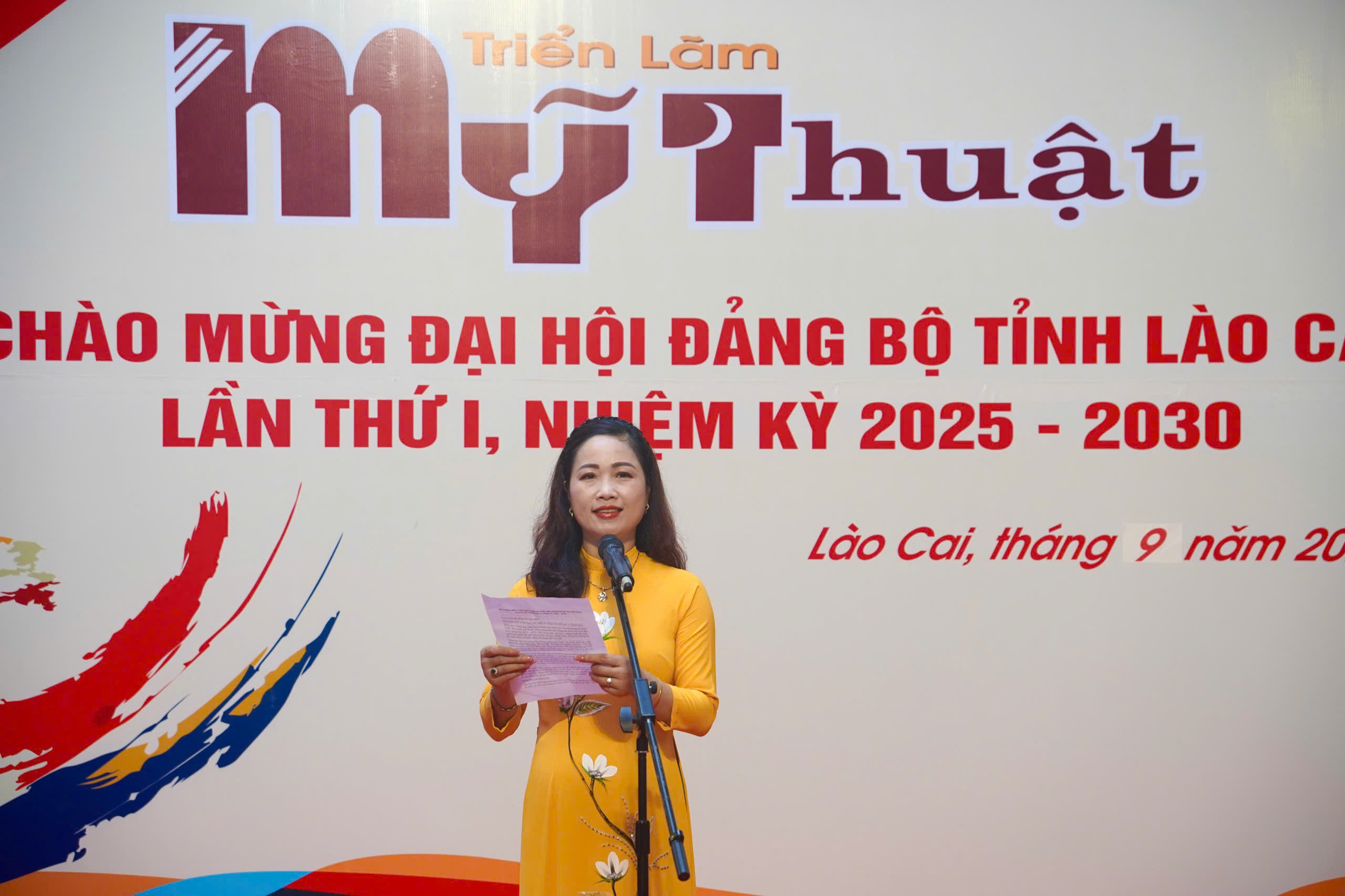 Nghệ sĩ ưu tú Đỗ Thị Thanh Hương - Giám đốc Trung tâm Văn hoá và Điện ảnh tỉnh Lào Cai phát biểu khai mạc triển lãm.