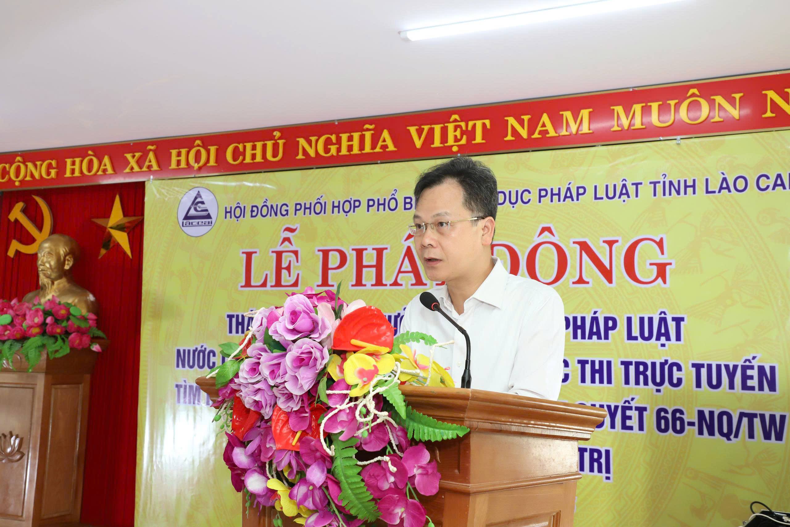 Đồng chí Nguyễn Thành Sinh - Phó Chủ tịch UBND tỉnh phát biểu tại Lễ phát động Tháng cao điểm hưởng ứng Ngày Pháp luật nước Cộng hòa xã hội chủ nghĩa Việt Nam năm 2025