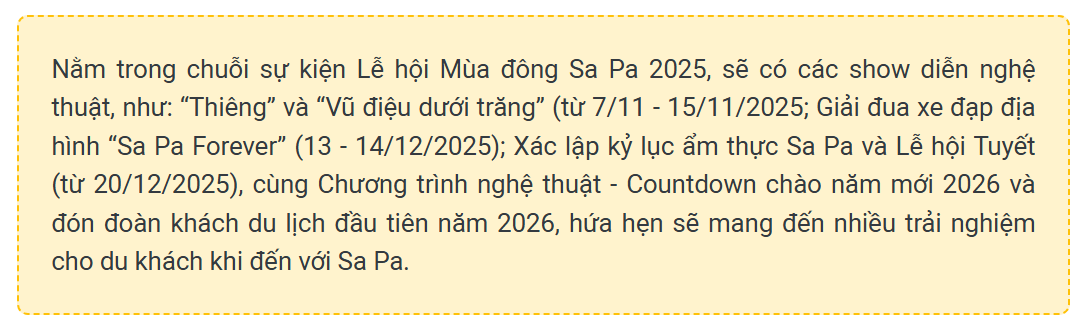 Với chủ đề “Sa Pa – Vũ điệu mùa Đông trong mạch nguồn văn hóa”, chuỗi hoạt động này kỳ vọng quảng bá mạnh mẽ du lịch Sa Pa, kích cầu du lịch mùa thấp điểm, góp phần thực hiện mục tiêu phát triển du lịch trở thành ngành kinh tế mũi nhọn của địa phương...