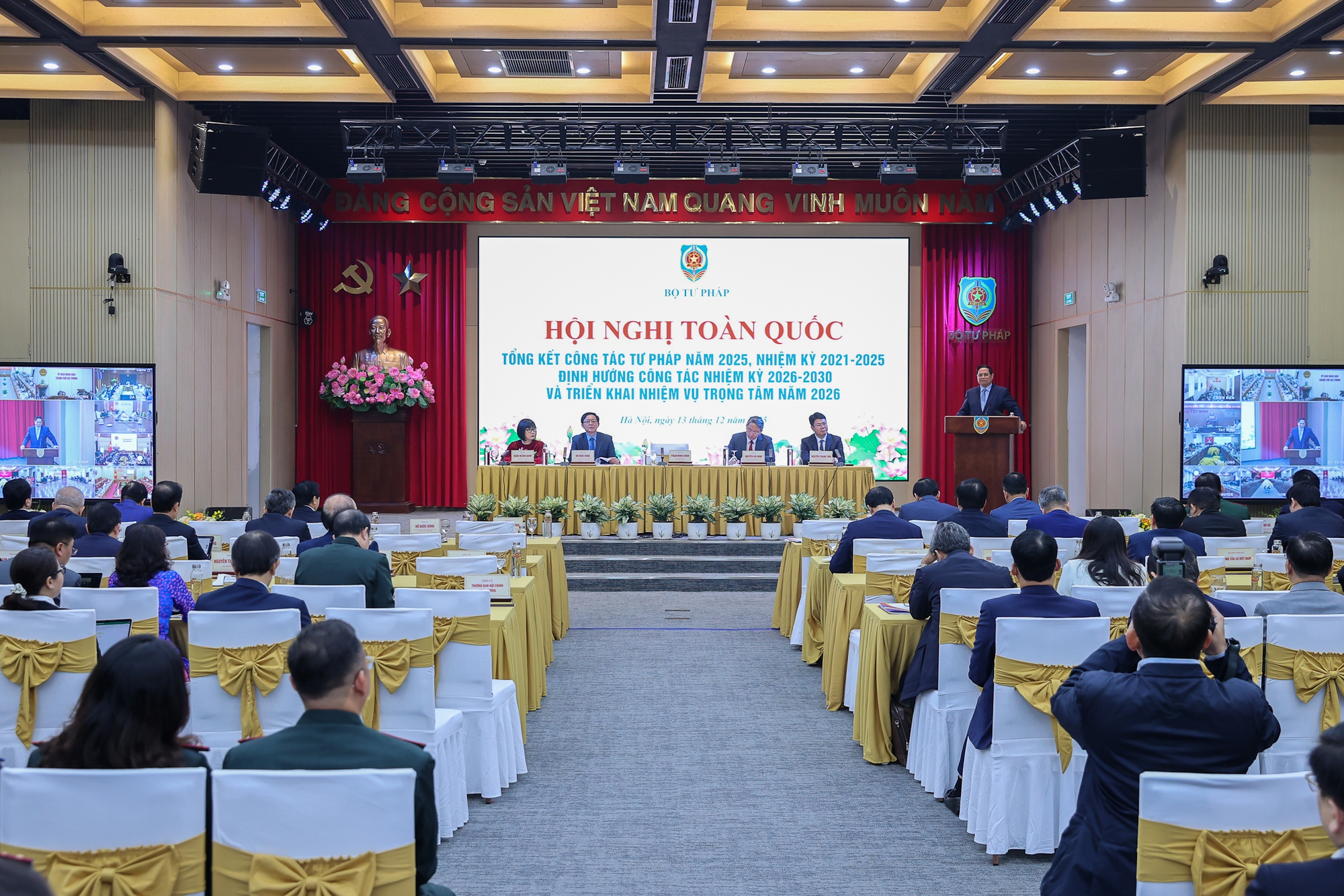 Sáng ngày 13/12, tại Hà Nội, Thủ tướng Phạm Minh Chính dự và phát biểu chỉ đạo Hội nghị toàn quốc tổng kết công tác tư pháp năm 2025, nhiệm kỳ 2021-2025; định hướng nhiệm kỳ 2026-2030 và triển khai nhiệm vụ trọng tâm công tác năm 2026. Thủ tướng nhấn mạnh, cần ưu tiên nguồn lực, đầu tư bài bản, xứng tầm cho công tác xây dựng pháp luật và chuyển từ "quản lý bằng pháp luật" sang "kiến tạo thể chế phát triển".Thủ tướng Phạm Minh Chính đến dự Hội nghị toàn quốc tổng kết công tác tư pháp năm 2025 - Ảnh: VGP/Nhật Bắc