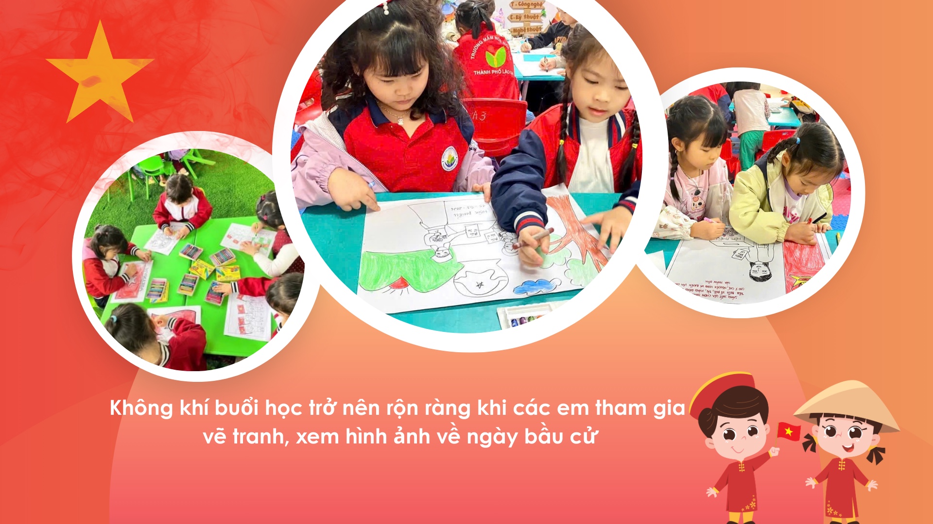Không khí của các buổi học trải nghiệm trở nên rộn ràng khi các em tham gia tô màu tranh, sáng tác vẽ tranh, xem hình ảnh về ngày bầu cử và hào hứng chia sẻ cảm nhận của mình. Những hoạt động trải nghiệm giản dị nhưng sinh động đã giúp các em tiếp cận kiến thức một cách tự nhiên, khơi dậy niềm thích thú và sự tò mò về các giá trị tốt đẹp của xã hội.