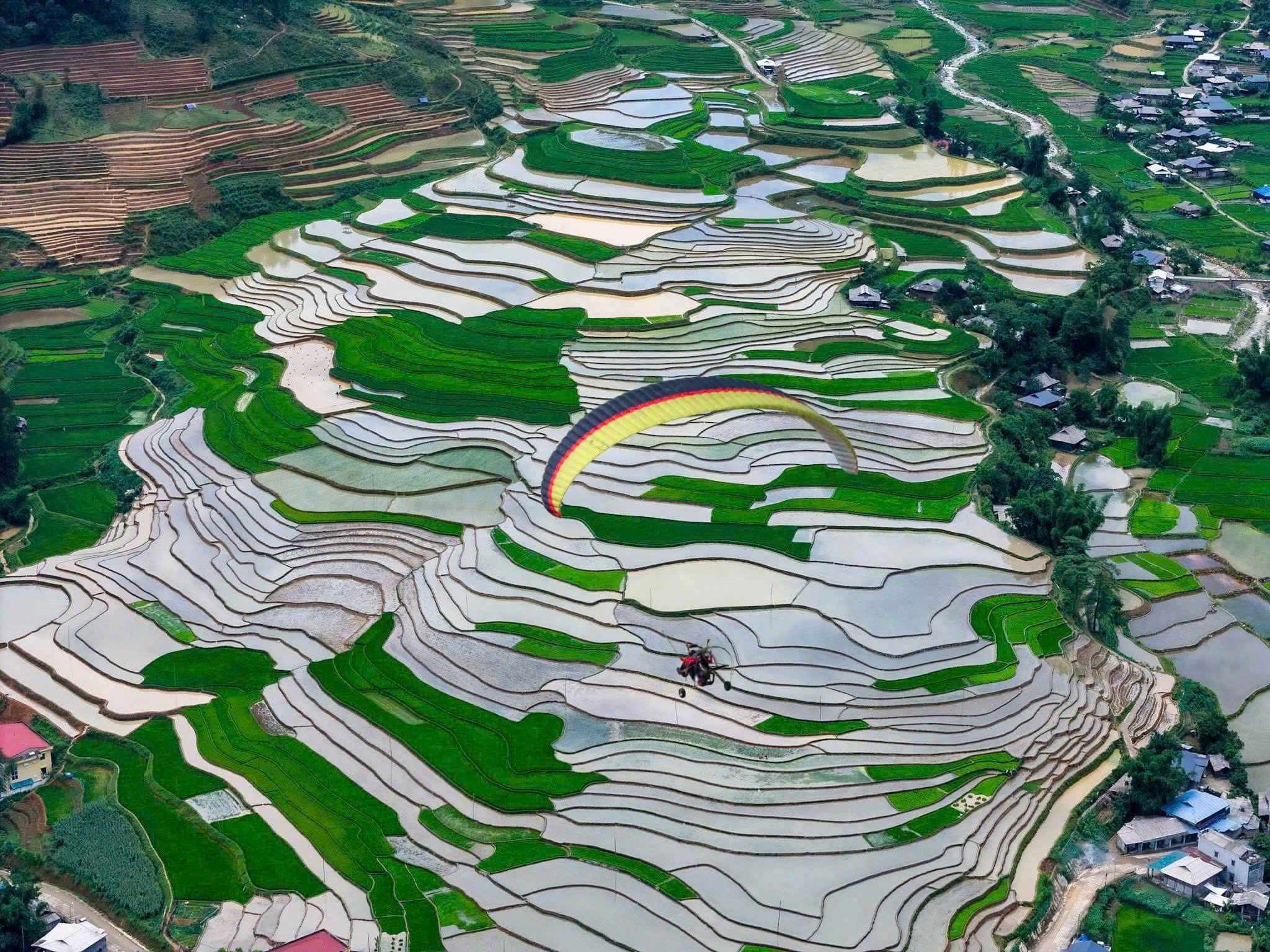 Hoạt động dù lượn “Bay trên mùa nước đổ” tại xã Tú Lệ mang đến trải nghiệm độc đáo, giúp du khách chiêm ngưỡng toàn cảnh thung lũng ruộng bậc thang rực rỡ trong mùa nước đổ từ trên cao.