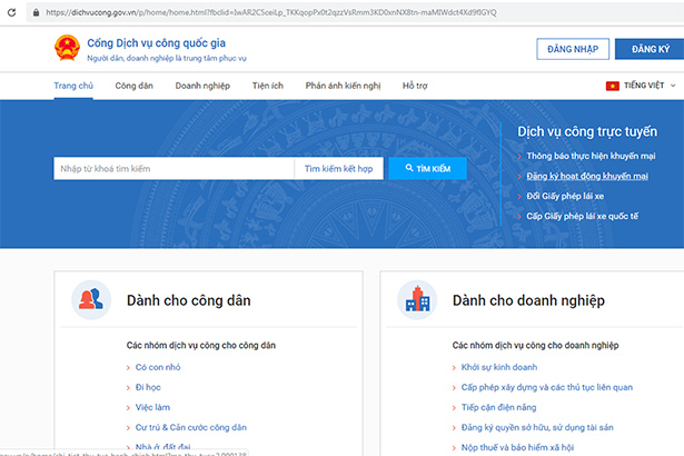 Cổng Dịch vụ công quốc gia có địa chỉ duy nhất www.dichvucong.gov.vn. Cổng là đầu mối cung cấp thông tin, hỗ trợ tổ chức, cá nhân thực hiện thủ tục hành chính, dịch vụ công trực tuyến và giám sát, đánh giá việc giải quyết thủ tục hành chính một cách công khai, minh bạch.