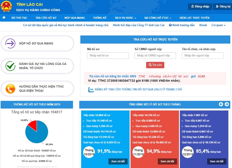 Năm 2019, bộ phận một cửa ở 3 cấp đã tiếp nhận gần 480.000 hồ sơ. Tỷ lệ hồ sơ giải quyết đúng hạn đều đạt trên 90%. Để tạo thuận lợi cho các tổ chức và công dân, Lào Cai đã triển khai gần 130 TTHC giải quyết theo hình thức liên thông như: đăng ký khai sinh, đăng ký thường trú, cấp thẻ bảo hiểm y tế cho trẻ dưới 6 tuổi, đăng ký khai tử, xóa đăng ký thường trú, hỗ trợ mai táng phí, thủ tục đầu tư cấp điện cho khách hàng sử dụng điện qua công trình điện chuyên dùng.
