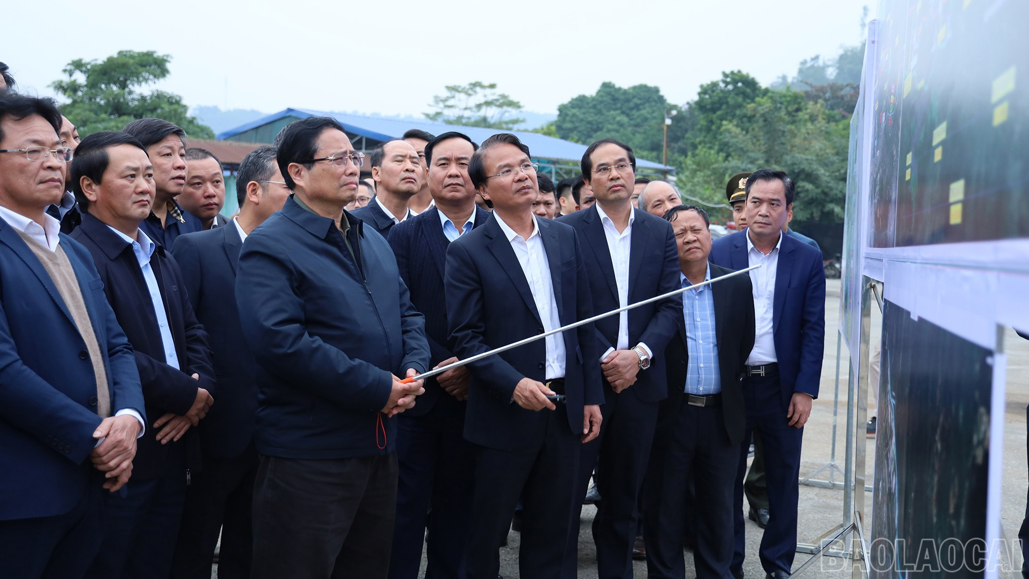 Chiều 22/12, tại vị trí dự kiến quy hoạch ga liên vận quốc tế Lào Cai, phường Lào Cai, TP Lào Cai, Thủ tướng Chính phủ Phạm Minh Chính và Đoàn công tác của Chính phủ đã khảo sát hướng tuyến đường sắt khổ tiêu chuẩn Lào Cai - Hà Nội - Hải Phòng.