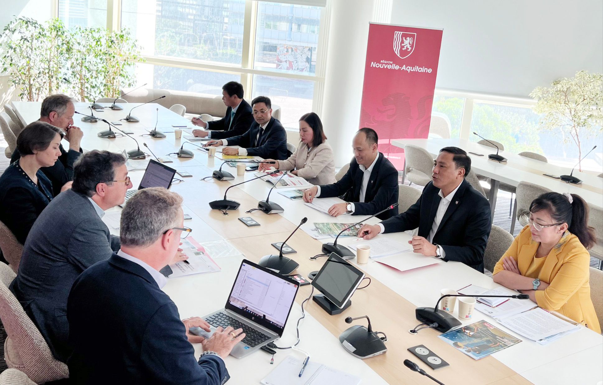 Sáng 31/5, sau khi dự các phiên làm việc trong khuôn khổ kỷ niệm 20 năm hợp tác giữa tỉnh Lào Cai (Việt Nam) và vùng Nouvelle Aquitaine (Pháp), tại trụ sở Hội đồng vùng Nouvelle Aquitaine (Pháp) đã diễn ra cuộc họp giữa Đoàn công tác tỉnh Lào Cai và các lãnh đạo, cán bộ dự án (Pháp) nhằm định hướng các nội dung hợp tác cho giai đoạn 2025 - 2027.