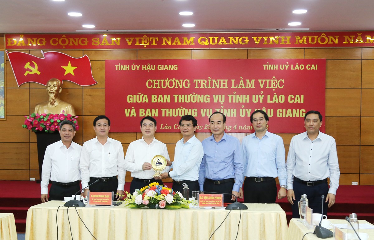 Sáng 23/4, tại thành phố Lào Cai, Ban Thường vụ Tỉnh ủy Lào Cai trao đổi kinh nghiệm xây dựng Đảng, phát triển kinh tế - xã hội, phát triển du lịch với Ban Thường vụ Tỉnh ủy Hậu Giang.