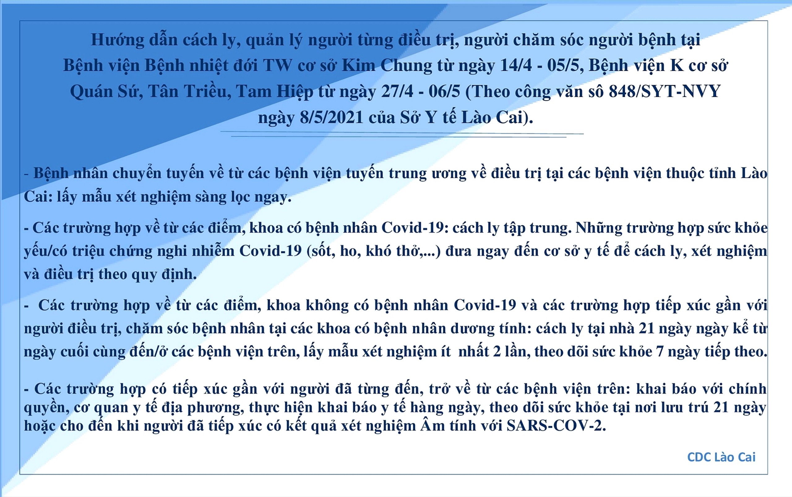Trong các trường hợp trở về từ Bệnh viện Nhiệt đới Trung ương cơ sở 2, tính đến ngày 7/5, Lào Cai đã xác định được 9 người đang ở tại địa phương; 7 người không có mặt tại địa phương và có thêm 10 người tự khai báo (là những người đến chăm người nhà tại bệnh viện).