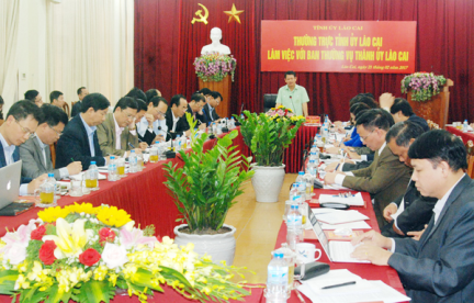 Sáng ngày 21/2, Thường trực Tỉnh ủy có buổi làm việc với Ban Thường vụ Thành ủy Lào Cai về tình hình triển khai nhiệm vụ năm 2017; triển khai thực hiện Nghị quyết 06-NQ/TU của Ban Thường vụ Tỉnh ủy về “Phát triển thành phố Lào Cai, giai đoạn 2016 - 2020, định hướng đến năm 2030”; triển khai thực hiện các kết luận và văn bản chỉ đạo của Ban Thường vụ Tỉnh ủy, Thường trực Tỉnh ủy đối với các nhiệm vụ liên quan đến thành phố Lào Cai.