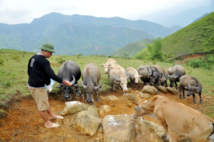 Anh Phây xách theo túi muối, chỉ lên đỉnh núi cao chót vót bảo đó là núi Tê Giác, đàn trâu bò của gia đình được thả trên đấy. Tôi theo chân anh vượt qua 2 ngọn đồi, gió thổi ràn rạt vào đám hoa mua tím ngắt, có cảm giác như đang đứng trên cao nguyên nội Mông hay đồng cỏ châu Phi xa xôi. Tiếng anh Phây hú gọi đàn gia súc về âm vang trong khoảng không trong vắt.