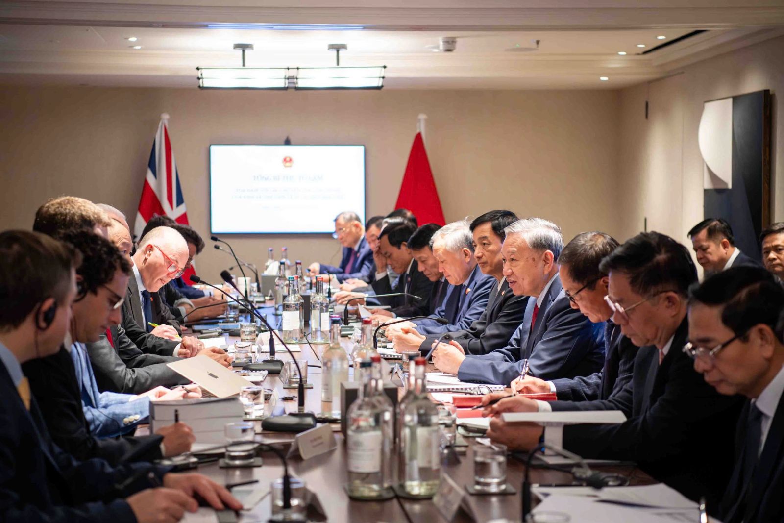 Tiếp tục các hoạt động trong chương trình chuyến thăm chính thức Liên hiệp Vương quốc Anh và Bắc Ai-len, sáng 28/10 (theo giờ địa phương), tại Thủ đô London, Tổng Bí thư Tô Lâm và các đồng chí trong Đoàn đại biểu cấp cao Việt Nam đã dự Toạ đàm với các chuyên gia công nghệ của Anh và thế giới về AI và Chip bán dẫn.