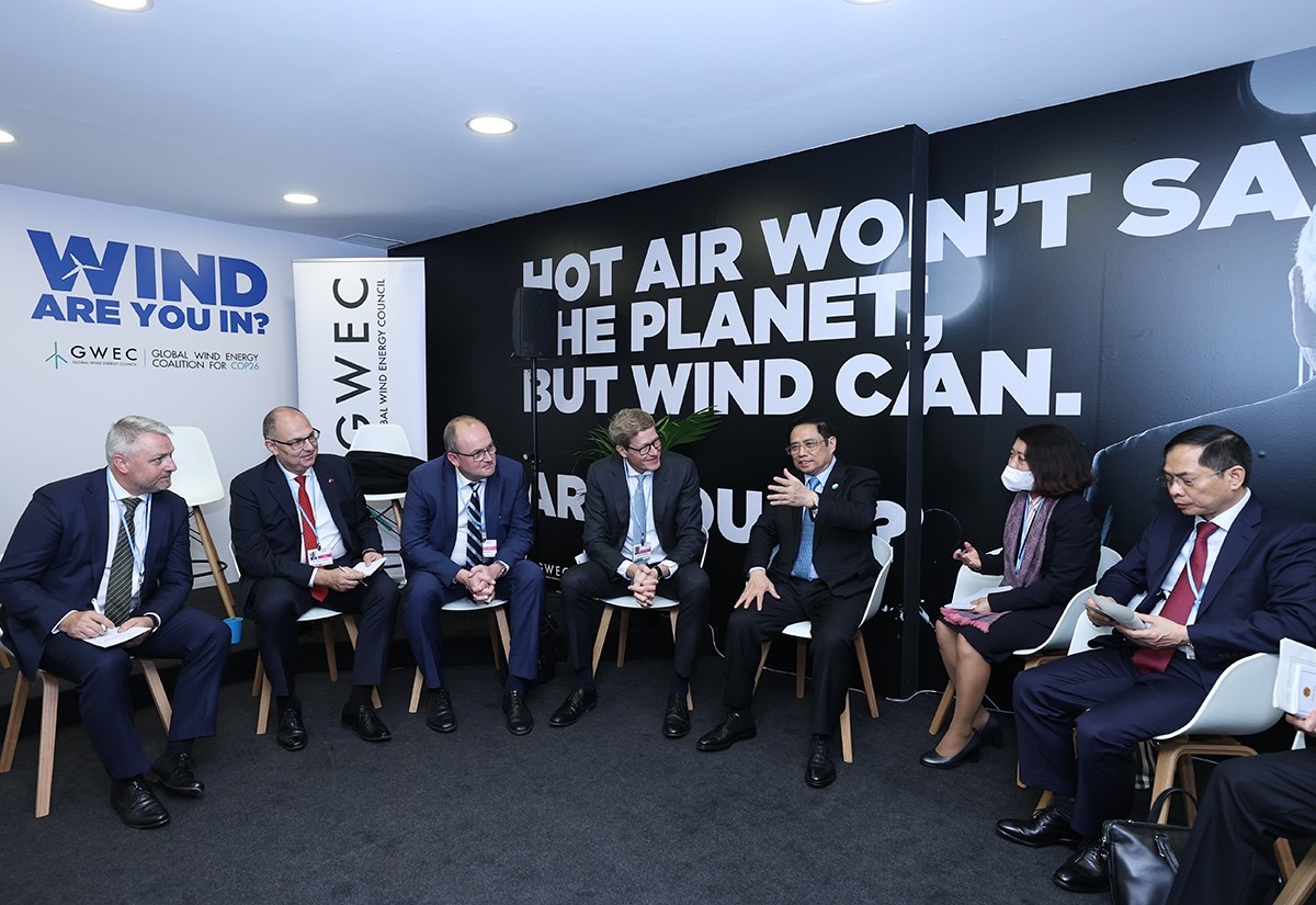Sáng 1/11 (theo giờ địa phương), tại Glassgow, Scotland, Vương quốc Anh, bên lề Hội nghị COP26, Thủ tướng Chính phủ Phạm Minh Chính tiếp Hội đồng năng lượng gió toàn cầu (GWEC); tiếp Chủ tịch tập đoàn kiếm giám đốc điều hành Tập đoàn năng lượng Điện gió Orsted và tiếp Giám đốc điều hành Lego.