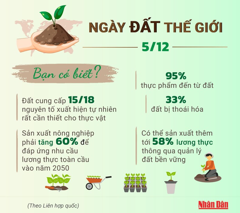 Ngày Đất thế giới (5/12) năm 2022 và chiến dịch "Đất: Khởi nguồn của lương thực" nhằm nâng cao nhận thức về tầm quan trọng của việc duy trì các hệ sinh thái lành mạnh và sự sung túc của con người bằng cách giải quyết những thách thức ngày càng tăng trong quản lý đất, nâng cao nhận thức về đất và khuyến khích xã hội cải thiện "sức khỏe" của đất.