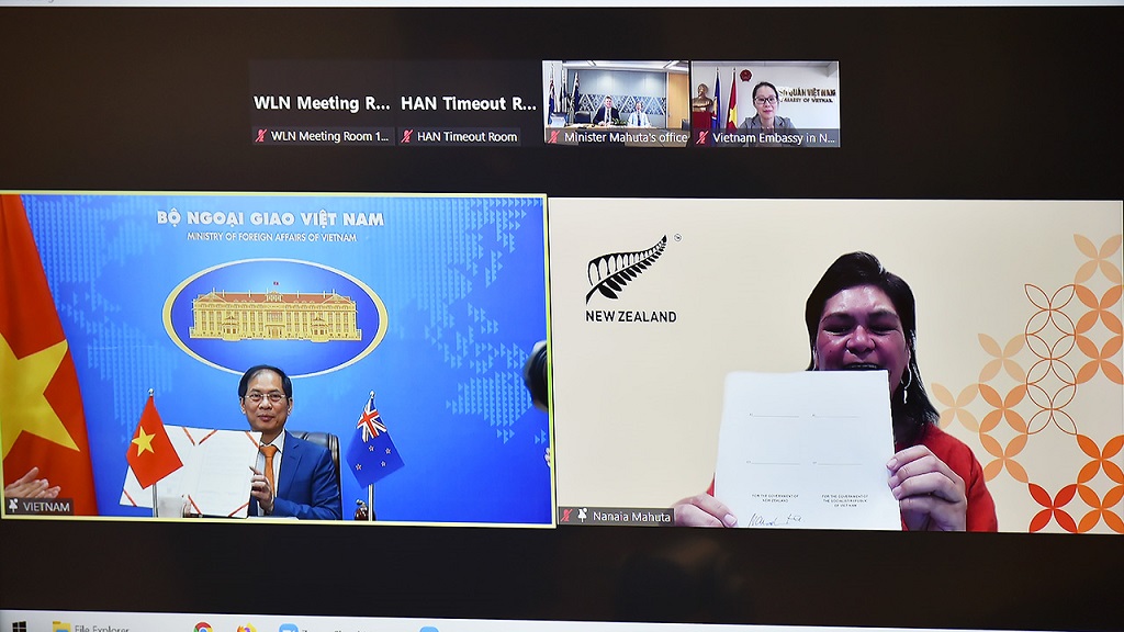 Nhằm triển khai thỏa thuận thiết lập quan hệ Đối tác chiến lược giữa hai nước, ngày 8/12, Bộ trưởng Ngoại giao Bùi Thanh Sơn và Bộ trưởng Ngoại giao New Zealand Nanaia Mahuta đã ký Chương trình hành động Việt Nam-New Zealand giai đoạn 2021-2024, theo hình thức trực tuyến.