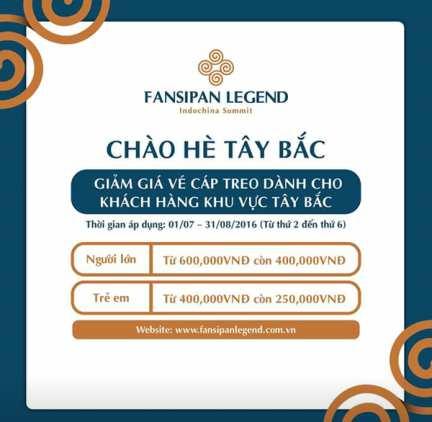 Theo thông tin mới nhận được, từ 1/7 đến 31/8/2016, Công ty Du lịch TNHH dịch vụ cáp treo Fansipan (Fansipan legend) bắt đầu chương trình khuyến mãi “Chào hè Tây Bắc” giám giá vé cáp treo cho du khách có hộ khẩu thường trú tại các tỉnh Tây Bắc: Lào Cai, Yên Bái, Lai Châu, Sơn La, Điện Biên, Hòa Bình.