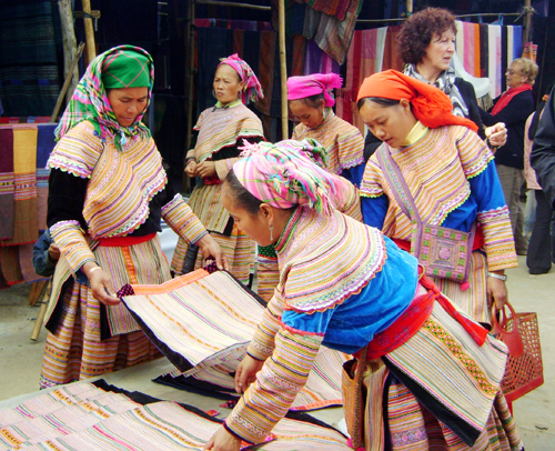 Người Mông cư trú trên khu vực cao nguyên Bắc Hà chủ yếu là dòng Mông hoa, với đặc trưng dễ nhận thấy nhất là bộ váy áo phụ nữ rực rỡ hoa văn gam màu nóng. Những dải hoa văn màu đỏ, vàng và xanh đan xen với nhau tạo nên bộ trang phục nổi bật giữa núi rừng.