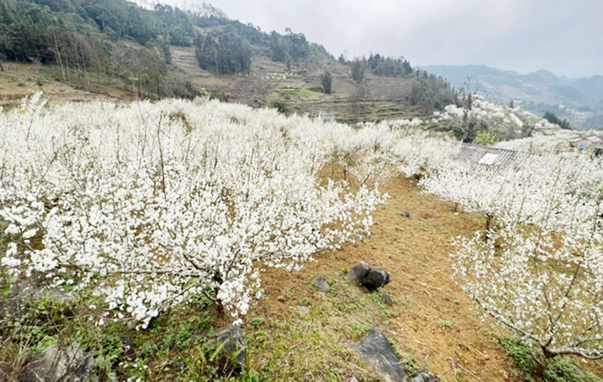 Đến xã Lùng Thẩn (huyện Si Ma Cai) vào thời gian này, du khách sẽ được chiêm ngưỡng những cánh rừng mận đang nở hoa rực rỡ. Giữa núi đồi nguyên sơ, những cánh hoa mận trắng tinh khiết, lung linh trước gió như gọi mời du khách.
