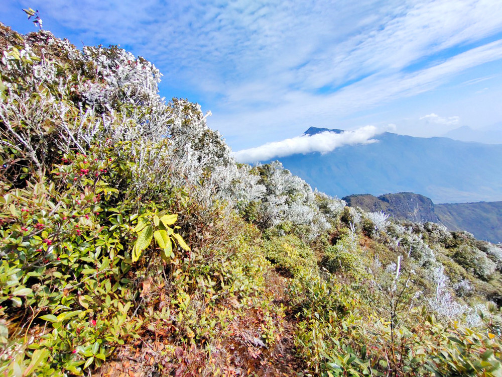 Sáng 19/12, tuy thời tiết có nắng nhưng trên các đỉnh núi cao của huyện Bát Xát như Ky Quan San, Lảo Thẩn, Cú Nhù San, cây cối vẫn bị phủ trắng bởi băng giá, sương muối tạo nên khung cảnh tuyệt đẹp. Nhiều du khách thích thú khi được trải nghiệm leo núi “săn” băng giá.