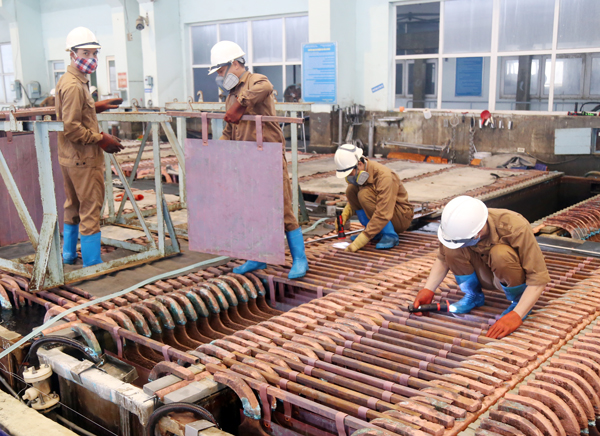 在老街铜业分公司电解车间里,酸蒸气从水箱中冒出,产生难闻的气味,但充分配备的专业劳动防护装置的工人仍在努力工作。老街铜业分公司副经理说,工厂生产线中的所有车间都有潜在的风险,要求每个工程师,工人都严格遵守劳动纪律,确保正确的技术流程,除此之外,还有专门的劳动保护设备。在过去的一段时间里,由于董事会的重视和指导,再加上员工的责任感,他们不允许发生职业安全和环境事故。员工的福利制度也得到了全面实施,分支机构为近540名员工提供了工作和稳定的收入,平均收入超过1000万越南盾/人/月。