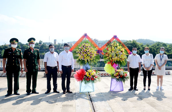 9月29日下午,在老街国际口岸,老街省代表团送花祝贺云南省(中国)周洪河市党委和洪河市人民政府(上图)。