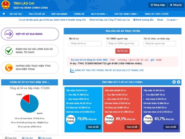 老街省的在线公共服务门户网址: dichvucong.laocai.gov.vn. 目前,老街省的公共服务门户网站已更新并实施了100%的行政程序。特别是在线 3级和4级公共服务,老街总共提供了1,155 / 2020程序(达到57%)。其中,第4级的在线公共服务程序为751 / 2,020程序,达到37%,超过了政府为当地设定的到2020年达到30%的目标。老街解决的在线文档占行政程序解决的文档总数的比例达到37%。