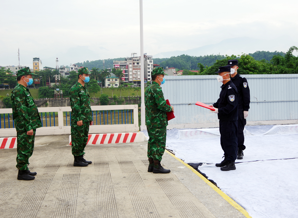 在老街-河口国际口岸分界线上,老街省边防司令部副司令员TRAN VIET HUYNH上校与洪河边防管理人员ZHAO ZHI HAO先生讨论并商定了此次会议的内容和方案巡逻以确保预防和控制 Covid-19疫情。