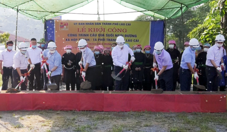接着,老街市人民委员会举行了连接Ta Phoi - Hop Thanh两个公社横跨Ngoi Duong溪的悬索桥的奠基仪式。