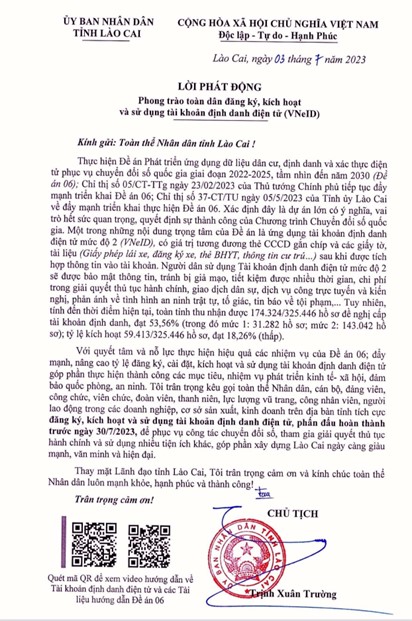 坚定决心、全力落实“06工程”任务,推动和提高电子身份账户注册率、安装率、激活率和使用率,为实现目标任务、经济社会发展、保障国家安全国防作出贡献省人民委员会主席号召全体人民,官员、党员、公务员、公职人员、工会会员、青年、武装部队、全省企业、生产经营场所的职工和职工积极登记、激活和登记使用电子身份账户,力争在2023年7月30日前完成服务数字化转型、参与办理行政手续等多项公用事业,为老街市日益富裕、文明、现代化作出贡献。